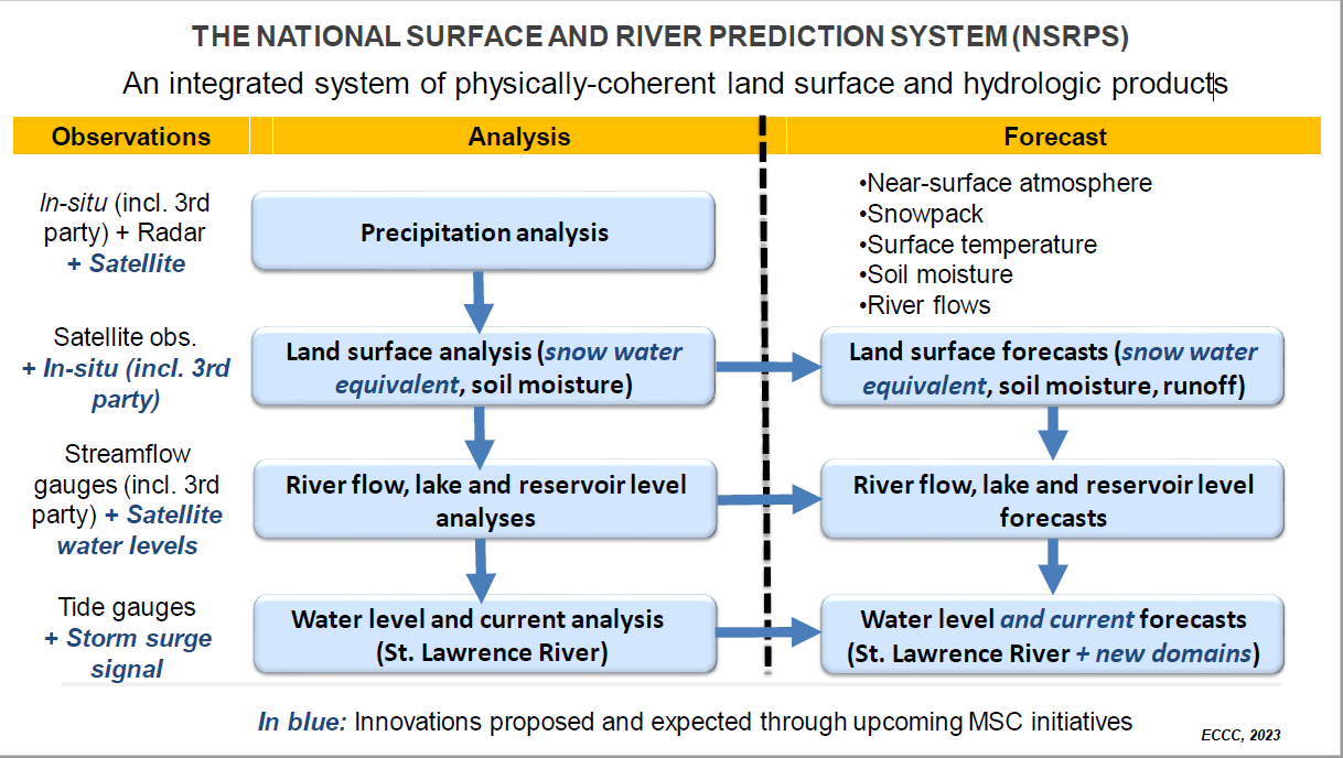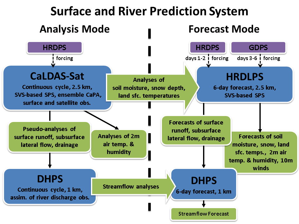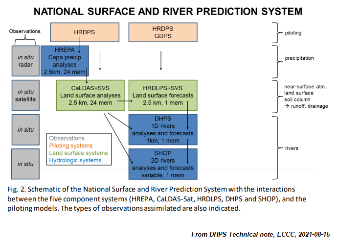 NSRPS (also known as GEM-Hydro) is a network of independent modelling systems , which aims to provide the best possible representation of the current and future states of the land surface, as well as the movement of water over and through the soil column and through the lake and river networks. NSRPS is an integrated chain of numerical prediction systems, driven by high-resolution atmospheric forcing fields from the High Resolution Deterministic Prediction System (HRDPS). The component systems of NSRPS include:
